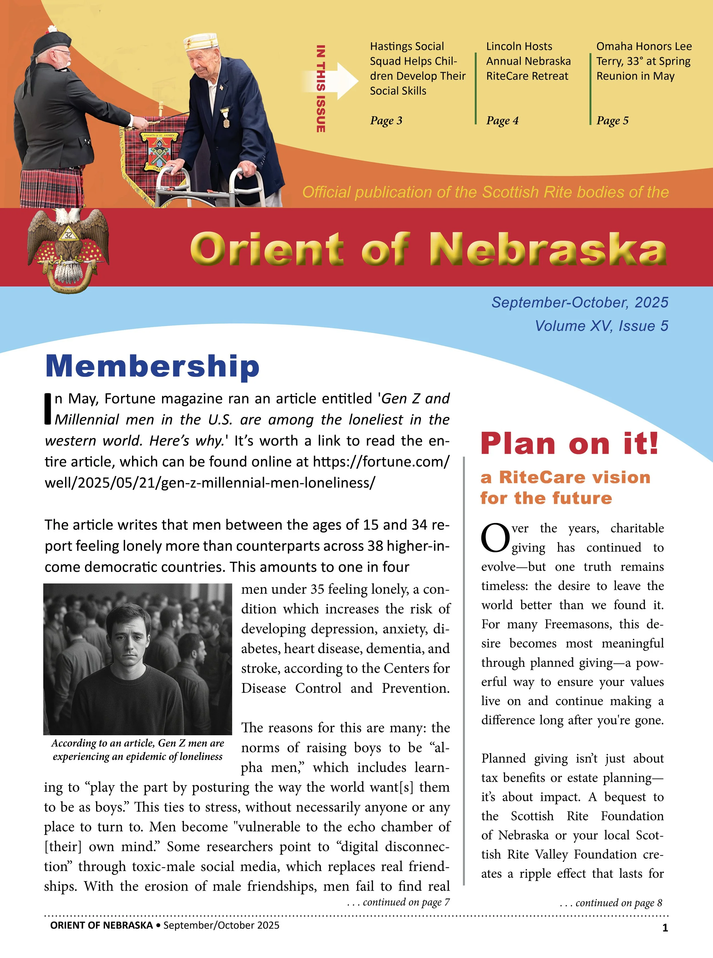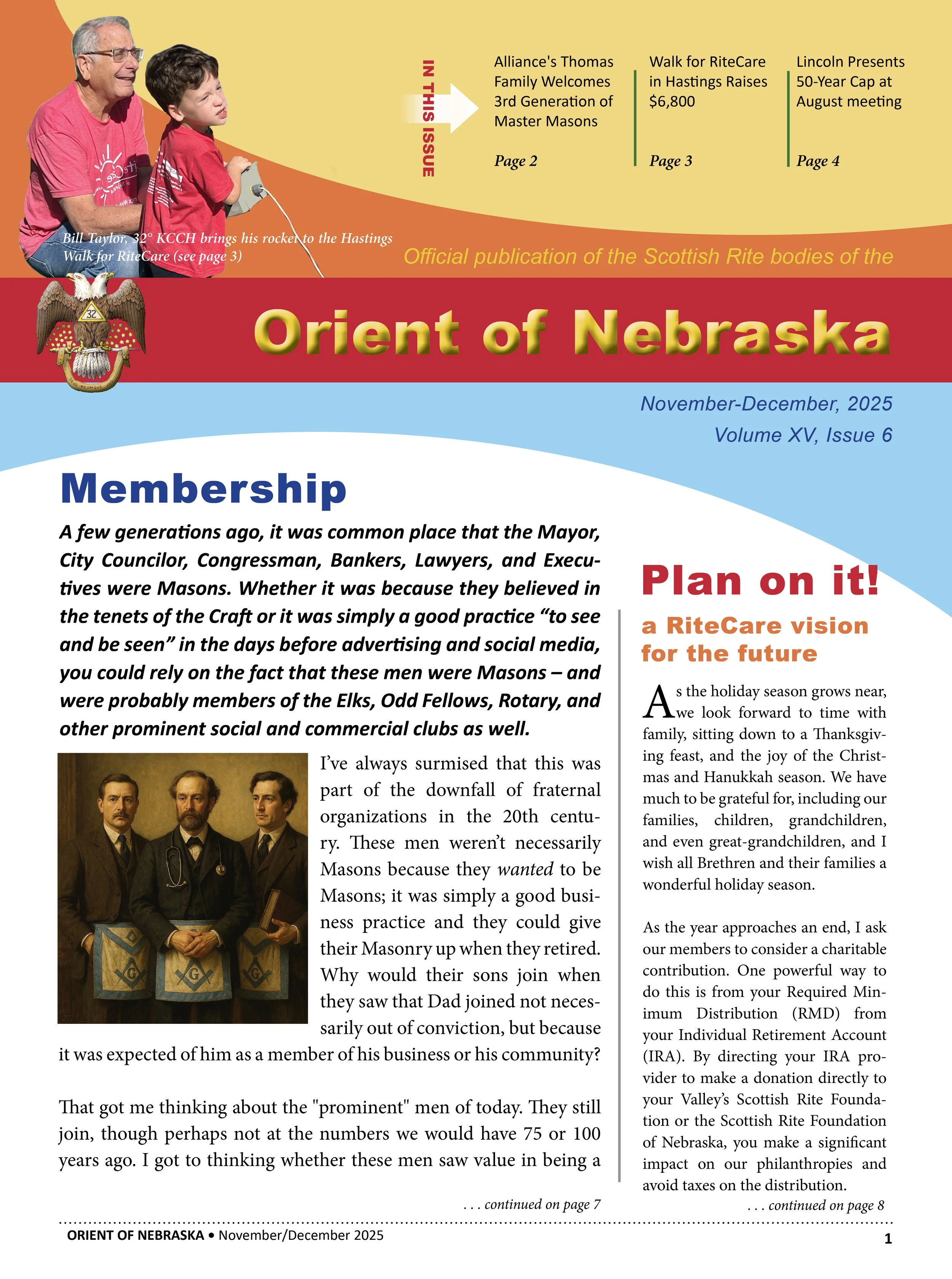 The Orient of Nebraska produces a newsletter six times a year, sent as an insert within The Scottish Rite Journal, produced by the Scottish Rite Supreme Council. The Orient of Nebraska insert is sent to all current members of the Alliance, Hastings, Lincoln, and Omaha Valleys. So grab a cup of coffee, sit back to read about Scottish Rite activities, events, members, and Masonic articles. You can open any file to read online or print. Take time to enjoy yourself. . .